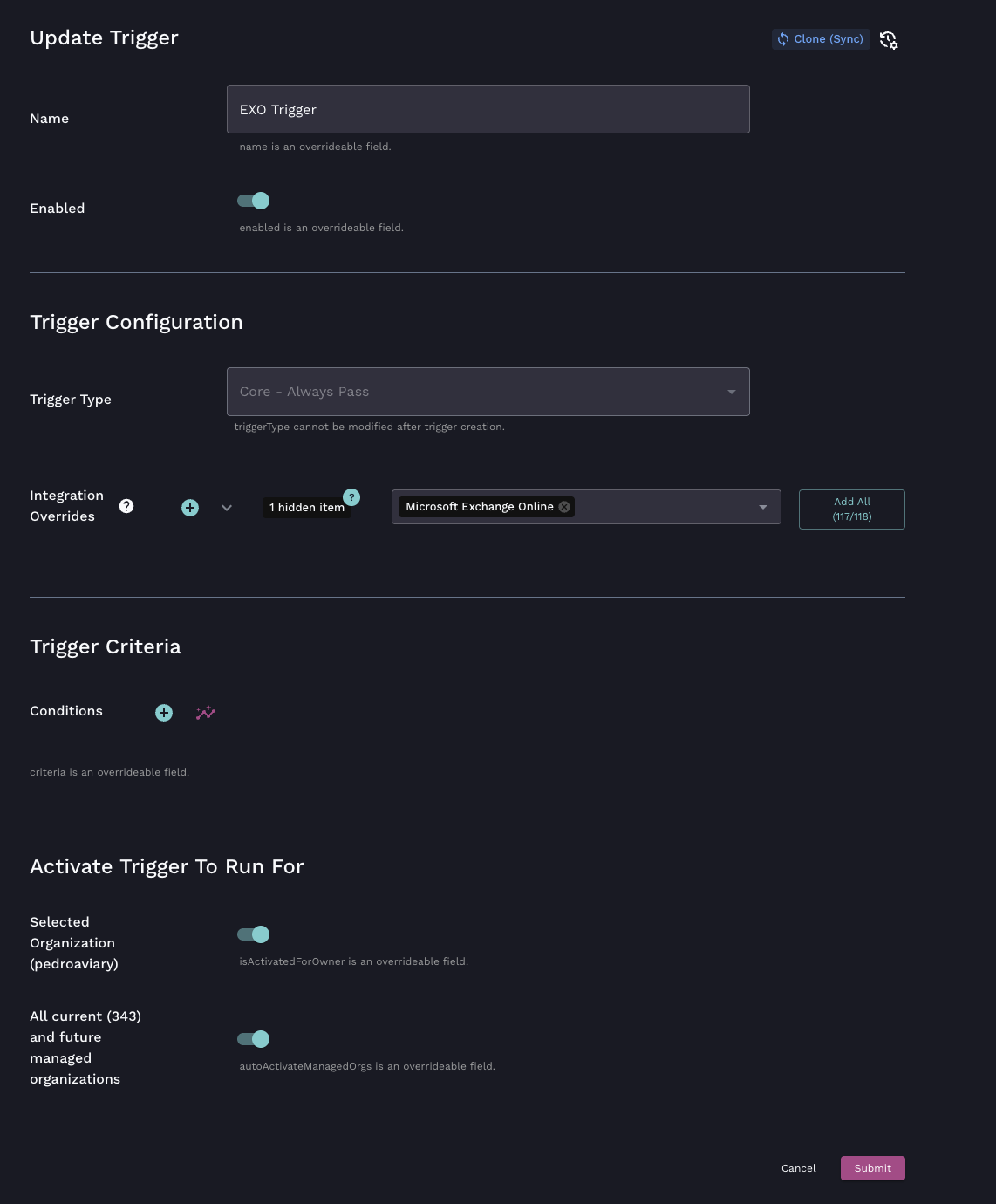 Integration overrides allow you to specify which integration configurations should be used. When a workflow is triggered by and running within the context of a child organization, by default they only have access to their own integrations and configurations. To give the workflow access to integrations and credentials owned by the parent organization, that default behavior must be explicitly overridden. In the above example image, the trigger allows your clients to use your PSA, RRM and licensing integration.