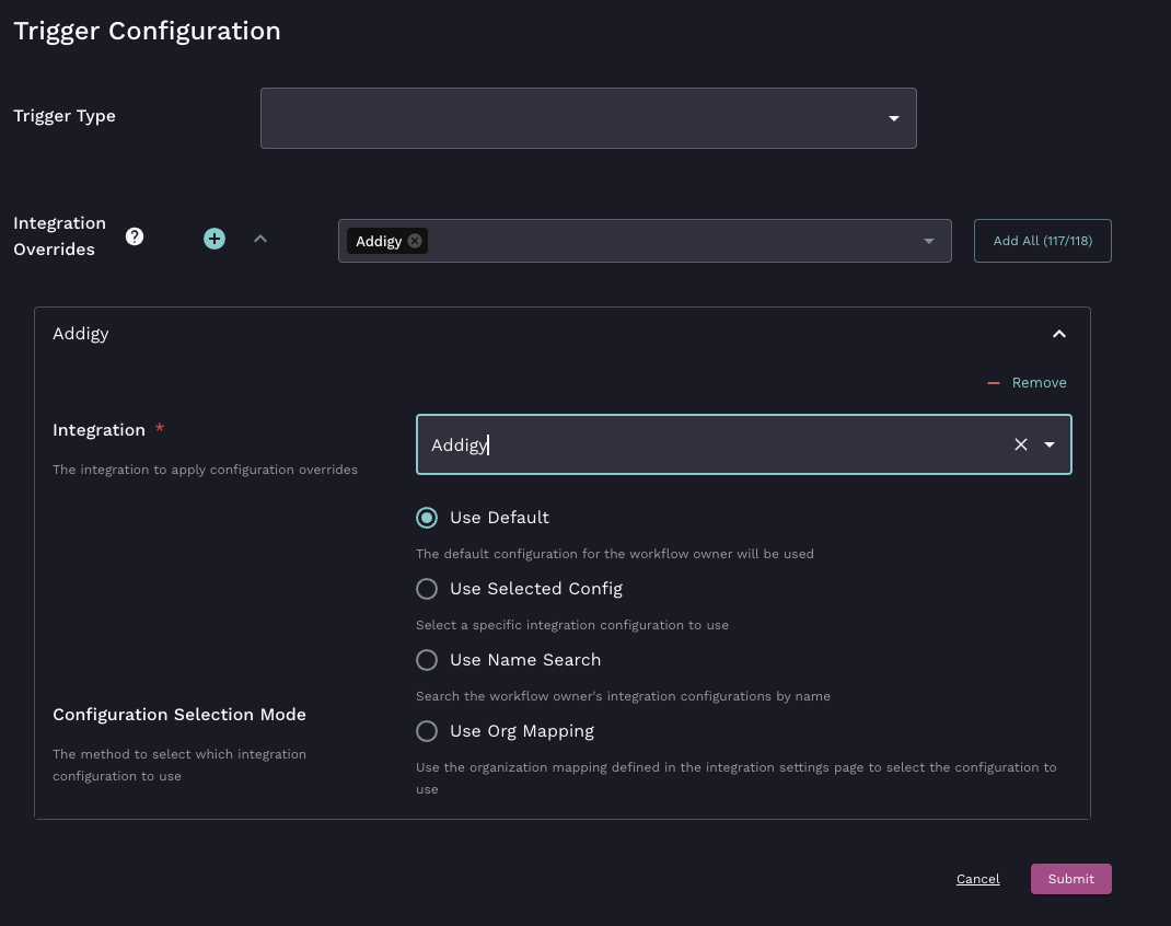 Update the relevant fields in the setup menu as needed, to set up your trigger. This might include integration overrides or tags.