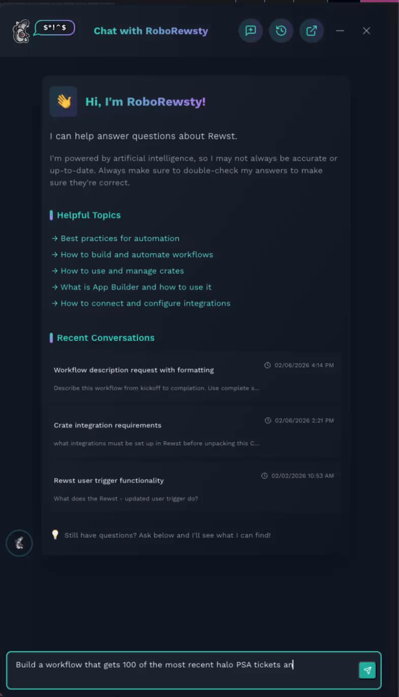 * Ask RoboRewsty questions about how to use platform features, setup, pre-built automations, and integrations. He'll return answers backed by our documentation, right where you’re working.&#x20;
