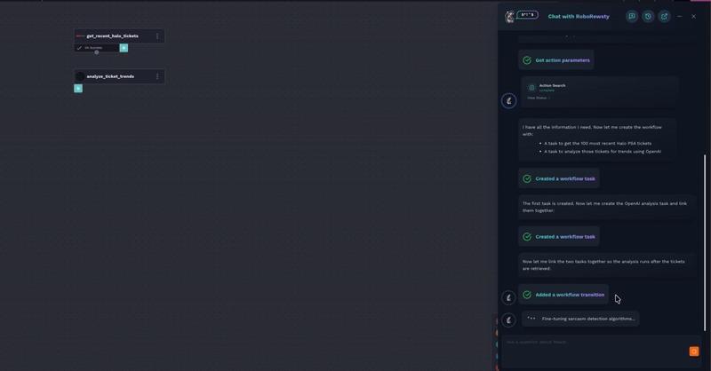 RoboRewsty can build workflows for you in Rewst. Enter your desired workflow query and watch him design and create, asking follow-up questions throughout the process to get to the root of your needs. Failure messages will appear in the flow of conversation as he runs into them. You can switch between browser tabs while he works without stopping the process, but closing the browser tab entirely will stop his work. You will likely need to [grant permissions](#additional-roborewsty-approval) to build the workflow, so paying attention to the processing to allow him to continue is necessary.